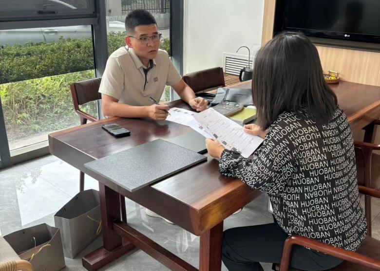 和栖岳精品酒店老板对接沟通了三四次,对我们业务经理的专业知识和人品都很认可,我们也始终主张“做生意先做人”的宗旨,人品正,产品和服务也差不到哪去!有了前期良好的了解做铺垫,再加上价格合理,又有专业的设计团队全程上门量尺、深化,客户也愉快的当场签约。