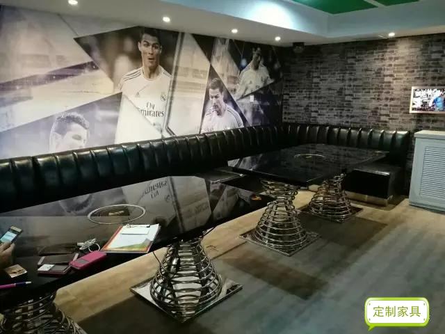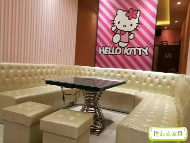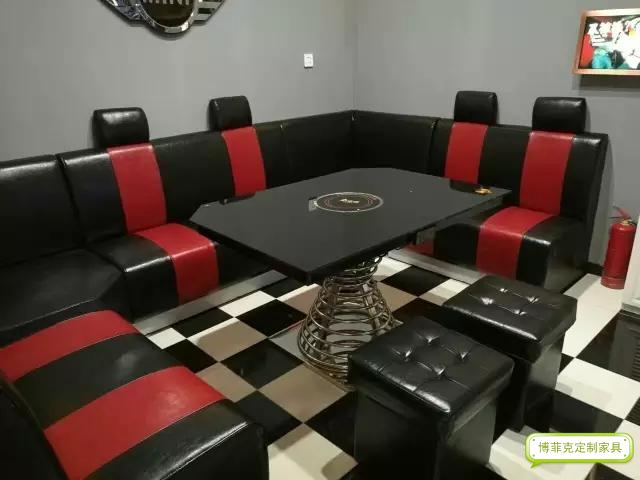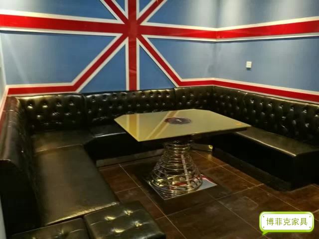 卡座沙发采用的是油蜡皮,价格实惠,虽然没有超纤皮那么结实耐用,但也是对得起他的价格的。茶几结合时尚与实用,采用不锈钢管焊制的底架,也很好的解决了电磁炉的线路问题,台面采用焗油玻璃,既有KTV应有的时尚,也解决了餐饮所要的实用。款式的多样性,使得工厂放样师傅也是费了一番功夫,索性效果也是预期的好,可见我们的放样师记忆之高超。