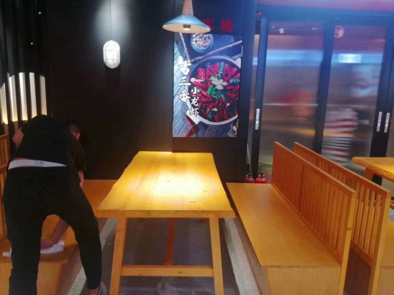 由西安博菲克定制家具厂为申记烧烤店定做的实木餐桌椅和卡座完工啦,当安装师傅进场安装结束后,整个餐厅顿时蓬荜生辉。