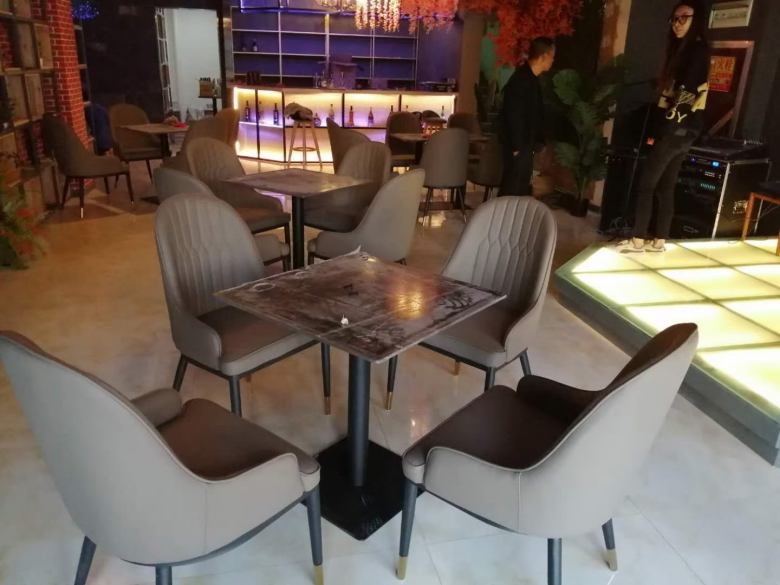 无烊音乐餐吧采购的桌子采用岩板台面和铁艺桌腿组合而成,岩板餐桌椅大气耐用,特有的石材色调能够迅速提升店面的档次。卡座沙发定制以及沙发椅均有严格要求,我厂依据客户需求完美呈现出了家具成品。
