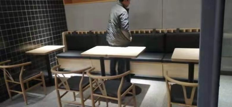 袁记肉夹馍餐厅餐桌椅及卡座沙发采用黑色皮革软包,与整店装修风格形成很好的结合,给食客营造出一种独特的古香古韵的环境!在安装现场,博菲克家具厂工人仔细按照图纸组装和摆放,另外一组认真把安装好的餐桌椅排列整齐,使得整个餐厅顿时焕然一新!