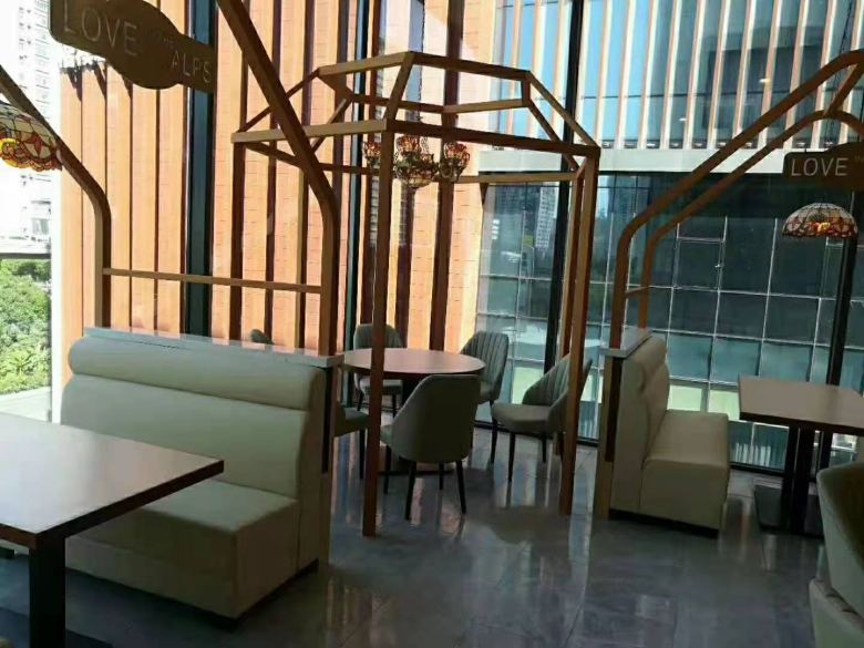 小编忙里偷闲随手在交货现场拍摄了几张店里的照片,通过照片可以直观的看到餐桌椅安装之后的效果是非常不错的,就连卡座沙发也是非常的有质感,而且偷偷的告诉各位老板,我们可是全国为数不多的为餐饮客户提供终身质保的餐桌椅厂家哦!
