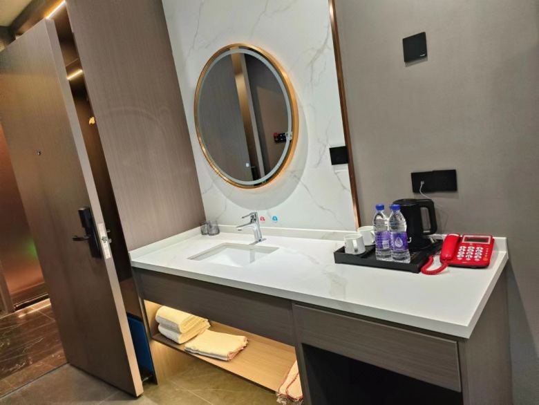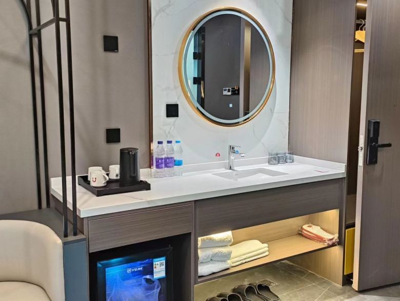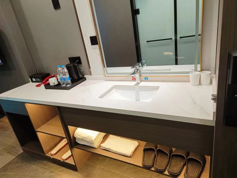 酒店客房家具由我厂负责生产,依据酒店设计效果图方案上门量尺、和设计师选定色板后再进行二次深化,整体客房家具采用免漆板制作,封边工艺细节处理无瑕疵,严格按照合同约定时间生产定制和上门安装,落地效果甲方一致满意!