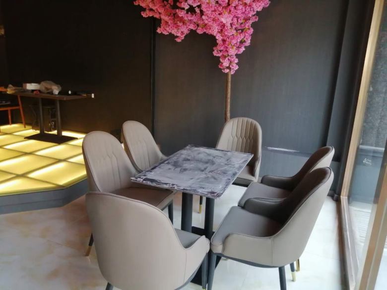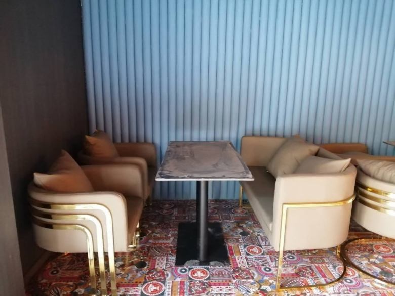 无烊音乐餐吧采购的桌子采用岩板台面和铁艺桌腿组合而成,岩板餐桌椅大气耐用,特有的石材色调能够迅速提升店面的档次。卡座沙发定制以及沙发椅均有严格要求,我厂依据客户需求完美呈现出了家具成品。