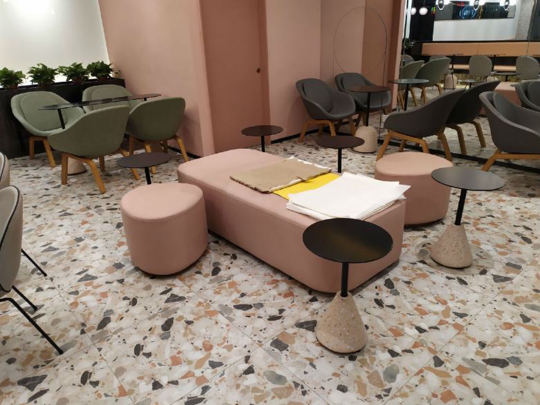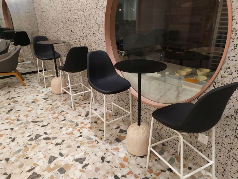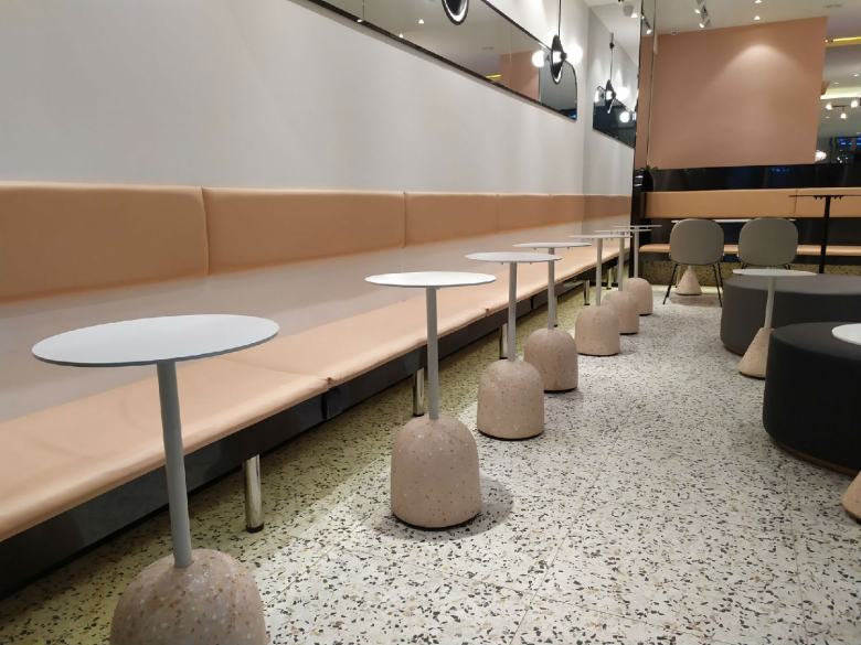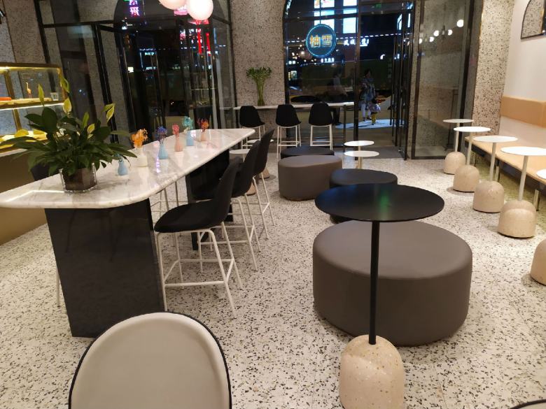 为了让店里的餐桌椅和卡座沙发达到理想的效果,经过设计师多次对店面效果进行深化,终于确定了家具搭配方案。休闲餐桌椅配上简约的卡座沙发,完美的与装修风格融合,既体现出了品牌元素,又迎合了年轻人的视觉审美,柚雪老板在安装完工之后还特意饶有兴致的随手拍了几张店里的家具照片分享到了朋友圈。